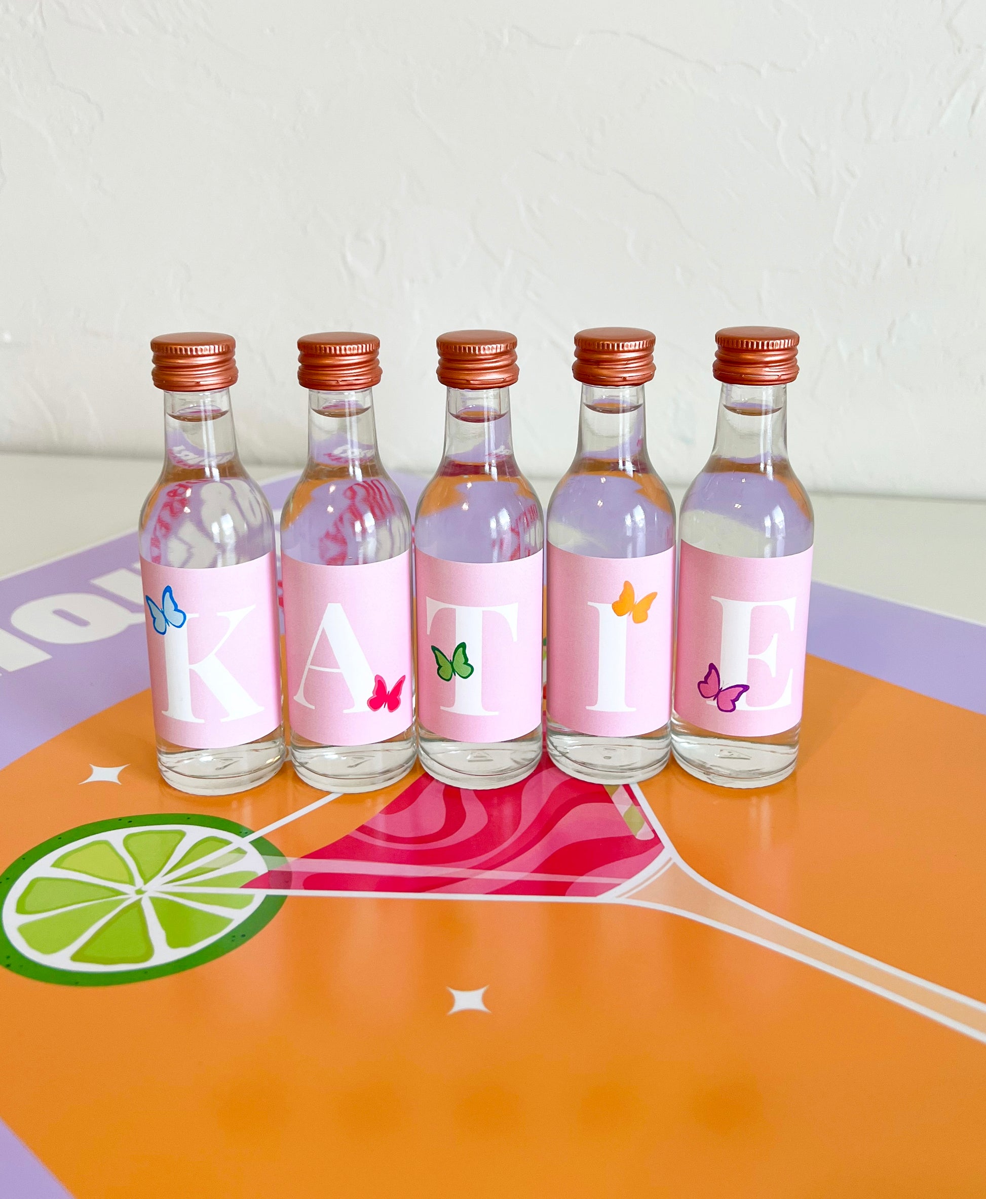 Customize any 50 ml bottle/pocket shot/airplane shooter with this butterfly label! Can say anything ex: NAME, CONGRATS, CHEERS, 21 age, initials, the list goes on!